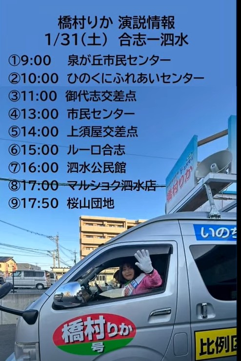 橋村りか街宣1月31日の日程 合志-泗水地区演説 応援ありがとうございました。