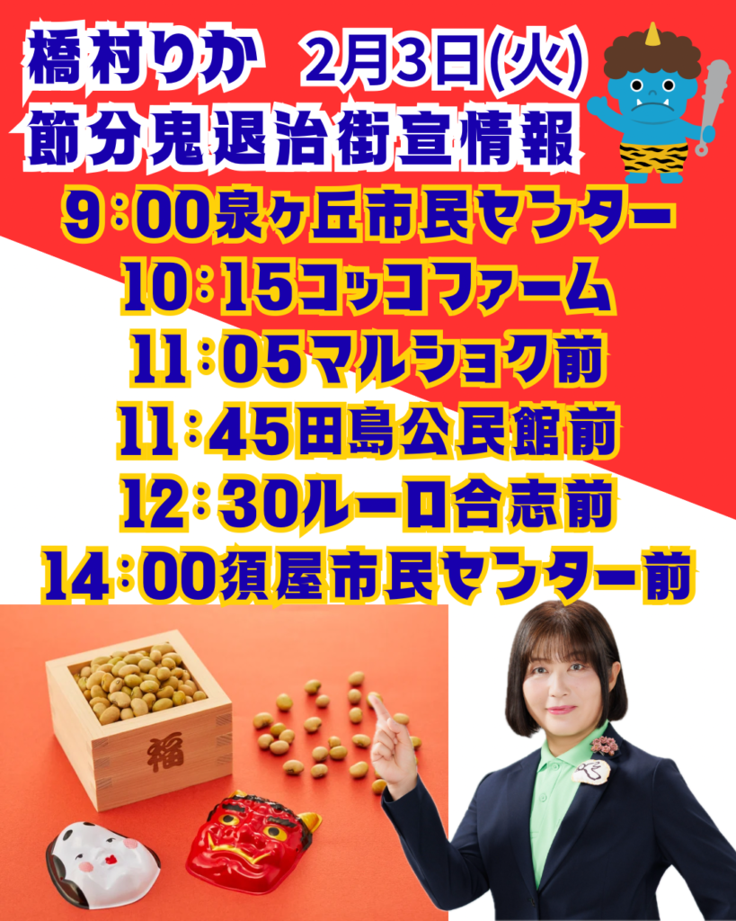 橋村りか街宣2月3日の日程 菊池市泗水町・合志市・菊陽町光の森 演説(応援ありがとうございました