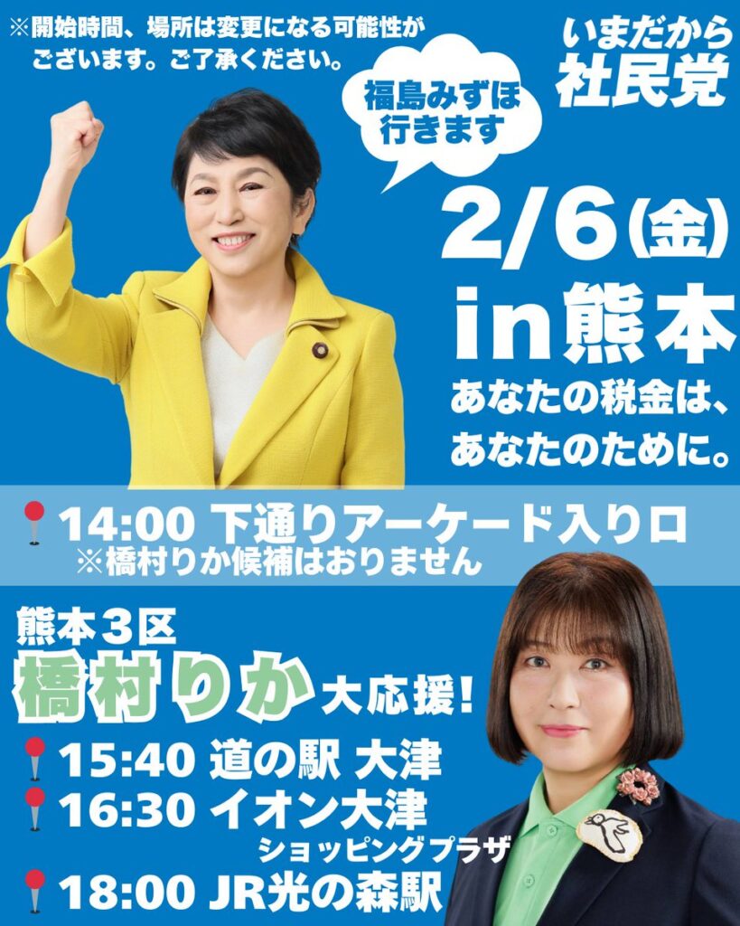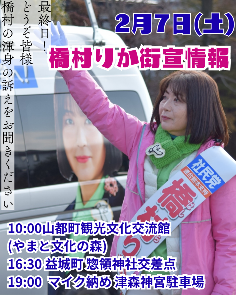 橋村りか街宣2月6日15時40分以降の日程(動画版はすぐ下です) 演説予定連日の応援ありがとうございます。福島党首と一緒に訴えました